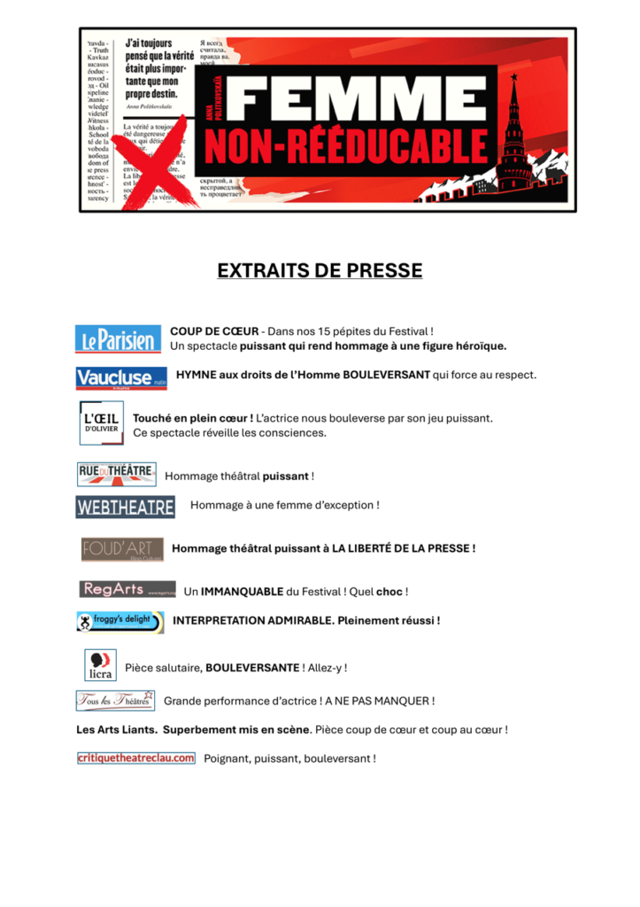 – Théâtre : « Femme non rééducable » avec Pierre Berçot et Caroline Rochefort, d’après l’histoire vraie d’Anna Politkovskaïa (journaliste russe assassinée pour avoir dit la vérité).