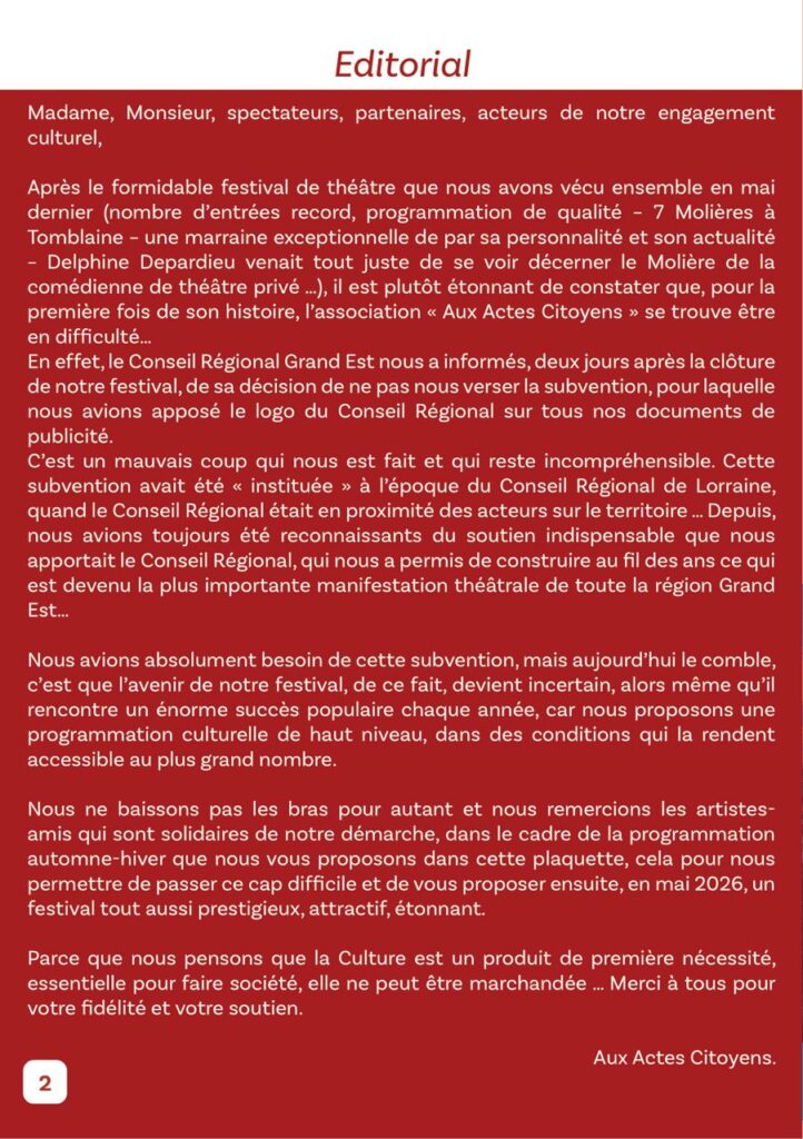 Il faut souligner l’irrespect des élus du Conseil Régional qui ont refusé d’entendre ou de rencontrer les représentants de cette association, bénévoles engagés au service de la Culture et du lien social, pour un festival qui a pourtant toujours valorisé notre région. Ce festival fait partie du patrimoine culturel régional, seul le Conseil Régional Grand Est semble l’ignorer…